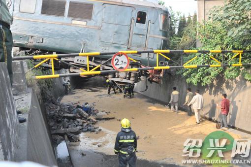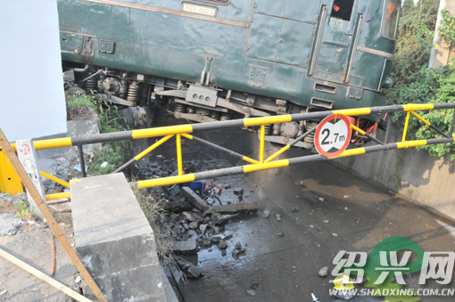 浙江在线10月19日讯 今日下午2点33分,越城消防大队接到报警称一辆装载货物的火车车头在距离绍兴火车站西面不远的寨下铁路桥处冲出铁轨,半截车头挂在了桥面下,并撞上桥下停着的一辆小三轮车,所幸三轮车主未在场,当时桥下也未有其他行人和车辆通过,并没有造成人员伤亡。