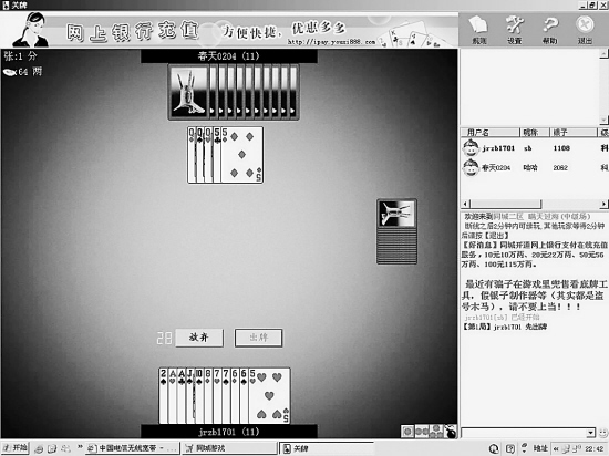 记者用一张50元的神州行充值卡换了48万两银子,进入了“关牌”游戏区。“关牌”游戏区下又分不同的区,各区之下还分房间,每个房间都设有对银子数量的门槛,其中“连环计”房间是贵宾室,只有拥有10万两银子以上的玩家才能进入,而“空城计”房间则需携20万两银子才能进入。