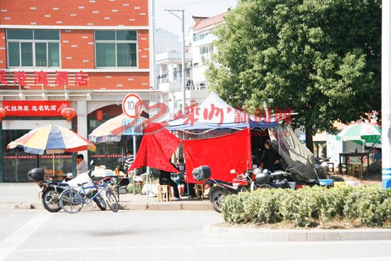 官河南路合新村五里浦绿化带里,违章搭建的简易棚棚下设着饮食摊,绿化带里还摆放着桌椅,另一边还摆着油氽果摊,影响了市容市貌,有煞风景。