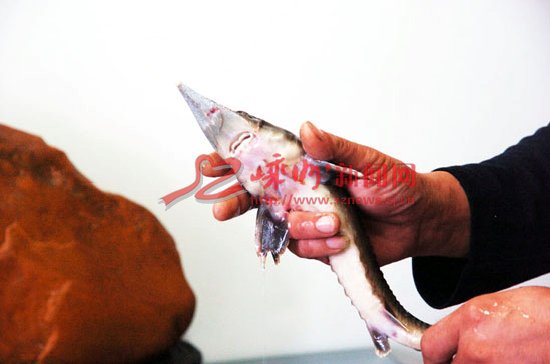 记者看到,这条鱼长30多厘米,头部特别尖,像是一个长鼻子,嘴巴长在下面,能让人想起电影里看到过的鲨鱼那恐怖的嘴,鱼的身上有五行坚硬的鳞(如图)。