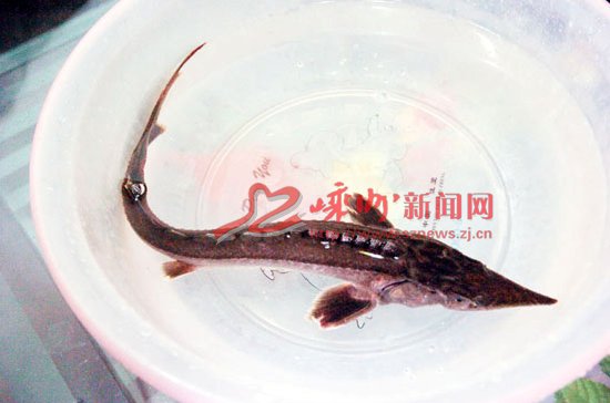 家住锦江花苑的裘毅是某领带企业员工,收集奇石是他的业余爱好。10月20日左右,裘毅与往常一样在剡湖街道竹山附近的剡溪边捡石头,突然看到一条鱼被挖沙船的机器抛了出来。“当时这条鱼被沙石撞得奄奄一息了。头尖尖的,嘴巴在下面。这么奇怪的鱼以前从没见过,不知道这是什么鱼,问沙船上的人,也说没见过。”