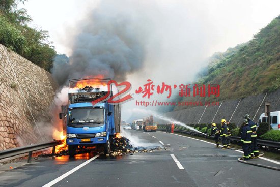 昨日上午7时许,一辆装载着2100箱康师傅方便面的大货车在途经上虞至三门高速公路43公里处(嵊州段)时,车厢里的方便面突然起火,我市消防部门接警后迅速前往扑救。