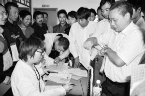 10月28日上午8时30分,嵊州市甘霖镇100多位正在嵊州市委党校参加党积极分子培训学习的学员,得知该市血库血浆告急的消息后,集体进行了无偿献血。图为学员们踊跃报名献血的现场。(来源:绍兴网—天天商报)