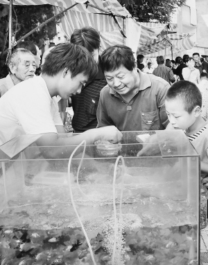金鱼这种城市市民喜欢饲养的小宠物,如今在嵊州市的乡村集市里也能目睹金鱼热销的场景,流动的小车载着这些游来游去的小金鱼,吸引人们购买。图为日前,该市鹿山街道市郊集市上人们购买金鱼的情景。(来源:绍兴网—天天商报)