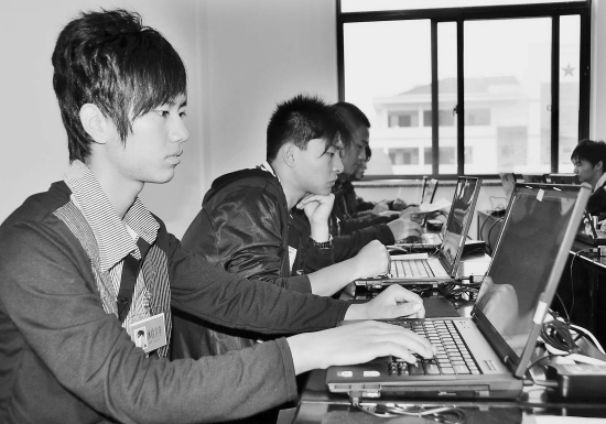 昨日,嵊州市投资2000万元新建的民兵训练中心迎来了首批体检的应征入伍适龄青年。图为首批应征体检青年正在新建成的电脑室里进行心理测试。 (