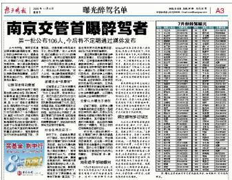 扬子晚报11月6日报道 从今天开始,南京正式通过媒体曝光醉酒驾车者,首批公布的名单共有106人,都是在7月份被警方查获并实施拘留的。交管部门介绍,曝光还将不定期发布。有人提出醉驾者拘留后还要被曝光是不是过于严厉一说,交管部门认为,曝光可以使醉驾者得到震撼,以后不敢再有类似行为,同时给其他司机以警示。