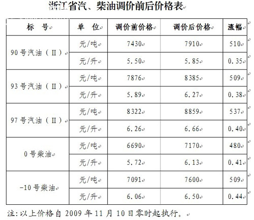 浙江在线杭州11月9日讯(记者 廖小清)今天晚上,浙江省物价局下发关于提高成品油价格的通知。从11月10日零时起,全省汽、柴油(标准品)最高零售价格每吨均提高480元。93号汽油(Ⅱ)由5.89元/升涨到6.27元/升,每升涨了0.38元。
