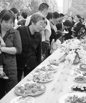 近日,嵊州市五爱幼儿园在该市文化广场举行了一场“巧手家庭厨艺大赛”。本次比赛旨在倡导家长树立绿色饮食、健康饮食的理念。经过班级推荐、幼儿园评审团初选,从2000多个家庭中推选出25个家庭,以小朋友自己动手为主展示厨艺。图为市民正在观看厨艺展。(来源:绍兴网—天天商报)