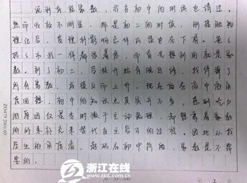 小王杭二中高二学生,11月7日晚,她还给母校杭州育才中学的校长郜晏中写信自曝了请家教的经历。她在信上说,初二时,受理科的影响总体成绩下滑,爸妈就给她请了一年的家教。不过,效果并不明显。初三学校开始晚自修后,就停了家教,成绩反而上升了。