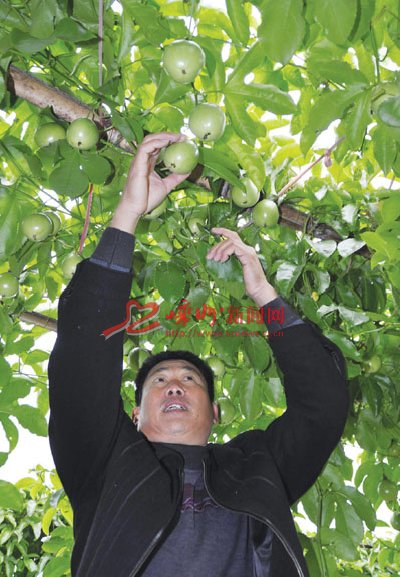 百香果因含众多水果的香味而冠名,学名为西番莲,味道鲜美,且营养丰富,在黄泽镇已形成了一定的种植规模。由于近日天气骤冷,为了防止成熟的百香果遭受冰冻,黄泽镇的果农们抢摘百香果。图为果农正在抢摘的现场。