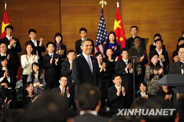 11月16日,美国总统奥巴马在上海科技馆与青年学生对话。新华社记者 裴鑫 摄