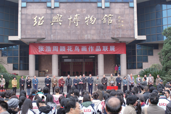 尽管寒流凛冽,但两位嵊籍画家的展览如同一股和煦的春风,在冬日的古城绍兴散发出特有的芳香。11月14日上午,由浙江省美术家协会、浙江画院、绍兴市文联主办的“张浩、周颖花鸟画联展”在绍兴博物馆开展。浙江省政协主席周国富,绍兴市政协主席顾秋麟,绍兴市委常委、宣传部长尹永杰,绍兴市人大常委会副主任车晓端,绍兴市政协副主席张伟波,绍兴市老领导袁长寿,我市市委常委、宣传部长何国英,以及著名画家曾宓、吴山明等出席了画展开幕式。