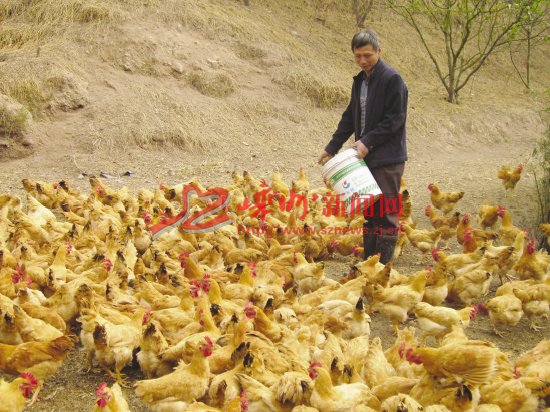 三界镇北街村村民吴石炯利用果园空气好、活动空间大、动植物饲料多、病虫害少等生态优势,分批循环放养土鸡,鸡肉质实、口感鲜嫩而不油腻,深受市场欢迎,每公斤价格达26元,一年可获收入5万多元。图为吴石炯正在给鸡喂食。