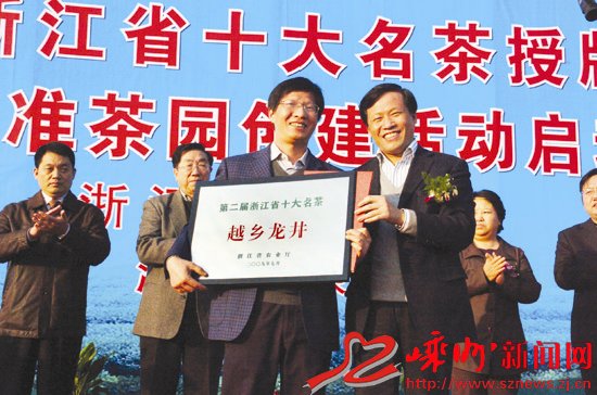 在第二届浙江省十大名茶授牌仪式上,孙景淼为获得浙江省特别荣誉名茶和第二届浙江省十大名茶的县(市、区)授牌并颁发荣誉证书。副市长郑法根代表嵊州市接牌(如图)。据悉,在省农业厅主办的第二届浙江省十大名茶评比中,我市选送的“越乡龙井”以满票荣膺第二届浙江省十大名茶榜首。而作为全省“全国标准茶园创建园”的样板地,黄泽明山茶叶标准园总面积5000余亩,原为上世纪五六十年代种植的老茶园,通过实施茶树良种化、生产标准化、设施现代化、管理集约化、产品优质化、销售品牌化、经营多元化,将打造全国一流的现代茶业示范园区,实现年产名优茶150吨,年产值达到2500万元。