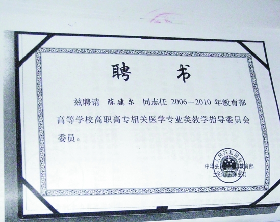 另外,在天一职业技术学院的教育成果奖申报材料里,记者还发现了一份2008年5月教育部颁发的“陈建尔同志任2006—2010年教育部高等学校高职高专相关医学专业类教学指导委员会委员”的证书(评上教指委委员的一般都是国家顶尖专家)。