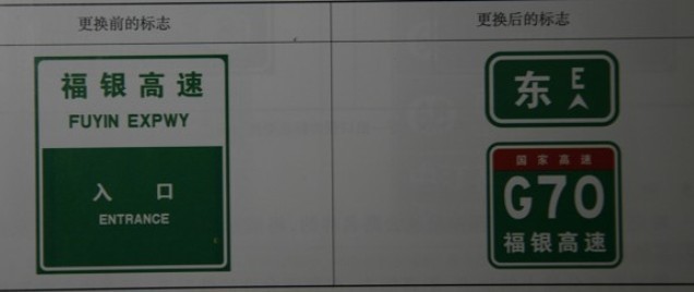 例如,原本“福银高速南昌东绕城段”的入口标志,一般是将“福银高速南昌东绕城段”字样显示在白底的版面上,入口及公里数显示在蓝底的版面上。更名后,“福银高速南昌东绕城段”编号为G70,入口指示牌也改成了全部蓝底,用G70表示福银高速,下面标示南昌绕城高速,以及入口公里数。