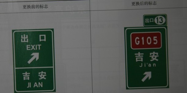 与此类似,出口标志也有改变。新标志以“出口—+数字”,如“吉安13”来表示出口在该路段13公路处。与原指示牌的另一个不同是,增加了红色的编号,如“G105”。