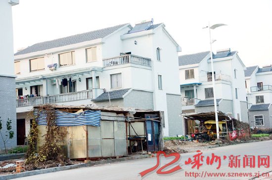市经济开发区下中西村建起了一排排漂亮整齐的别墅房,成为新型农村社区。但就在新别墅旁边还搭建着几间简陋的竹棚。破旧的工棚和靓丽的别墅房格格不入,有煞风景。