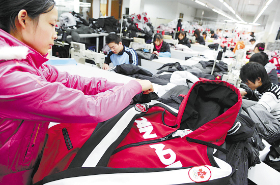 德利服装有限公司的工人正在加班加点赶制温哥华冬奥会组委会追加的3万套服装。该公司凭借雄厚的技术实力,成为2010年加拿大冬奥会的配套生产单位。据悉,这批服装主要是工作人员专用服装,以及嘉宾和纪念服装。 记者 梁臻 摄