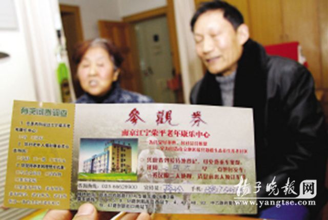 上个月底的一天,刘大妈夫妇去新街口附近一家医院看病,被一个小伙拦住了。小伙递给他一张“荣平养老院”参观券,告诉他们:“凭这张券,可以免费乘车去养老院参观。”