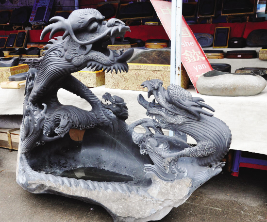 昨日,竞卖价高达百万的安徽歙县九龙争珠砚,在书圣故里嵊州找买家。当日,安徽歙县砚商共有近千方砚台在嵊州竞卖。九龙争珠砚为安徽省青年雕砚家汪勇历时一年多精雕而成,该砚长宽高分别为170、140、60厘米,实为罕见。 (来源:绍兴网—天天商报)