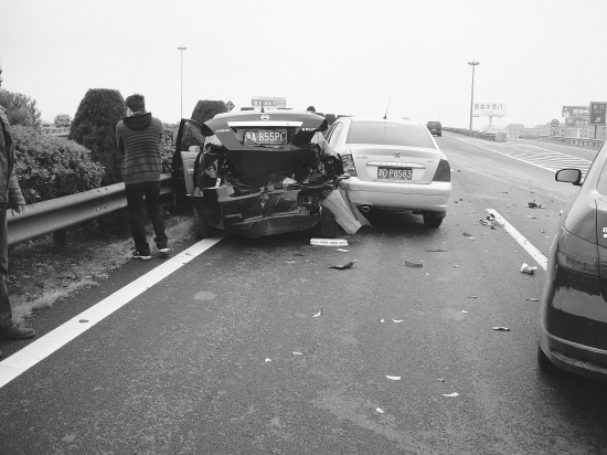 12月13日上午11点左右,嵊州人王某驾一辆标致轿车从杭州回嵊州,车开过嵊州出口附近他才反应过来,他立即来了个急刹车。结果导致3车追尾,现场一片狼藉,除王某的车内无人受伤外,其他两辆车内均有人员受了皮外伤。 (