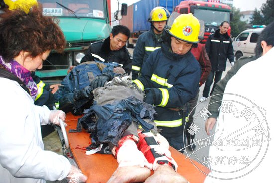 这天上午6时许,市消防大队官兵刚刚出操归队,值班室电话突然响起急促的铃声:“长乐镇路口转盘处发生一起交通事故,一男子双腿被一辆集装箱货车轮胎压住,伤势比较严重,你们快点去救人!”接警后,消防大队立即出动两辆消防车、10余名指战员火速赶赴现场。6点55分,消防官兵到达现场。“快救救我吧,我的双腿不能动了,我不想残废……”一声声凄惨的求救声从这辆集装箱货车底传出,一名男子双腿被集装箱货车右前轮压住,身体已无法动弹,浑身已被腿部流出的血染红。见此情况,消防指挥员立即下达作战命令。1分钟、2分钟……随着压住伤员双腿的轮胎被千斤顶慢慢撑起,伤者的两条腿终于脱离了“虎口”。至6点58分,被困伤者被消防官兵成功救出,并被送上现场待命的120急救车送往医院抢救。