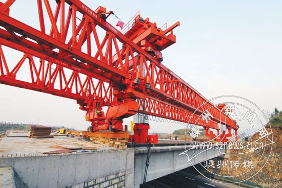 12月20日,2台吊机和1台架桥机将高2.9米、重230吨的最后一片54米T梁安全平稳地架设在1号台上,104国道嵊州段改建工程三界分离立交桥 54米T梁双幅架设完毕。这标志着跨越上三高速公路的第一跨顺利贯通,并创造了嵊州交通史上桥梁单跨最长、单片梁板最重的两项记录。图为104国道三界分离立交桥架设T梁的场景。