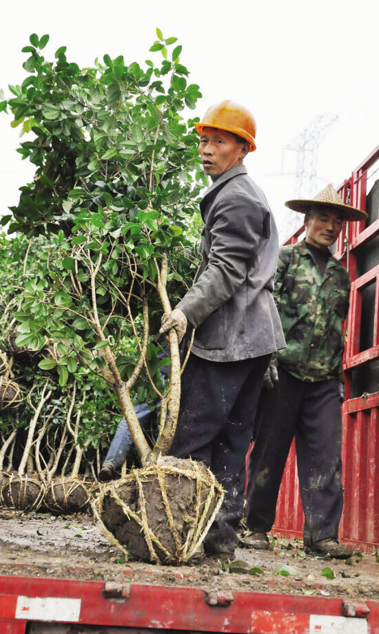 嵊州是浙江省首批花卉苗木产业强县,近年来该市扩大重点产区规模,优化种植结构,壮大龙头企业,健全销售网络,整合优势花木资源,呈现出一年四季花木俏销的好势头。图为日前该市甘霖镇的一个花木基地里农民正在冒雨装车。(来源:绍兴网—天天商报)