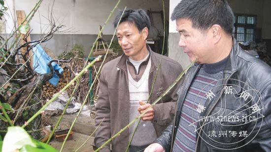 省级示范专业合作社——市诚信茶果专业合作社社长单伟强(左)与花木种植大户一起探讨花木嫁接技术。