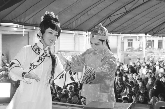 从12月19日起,嵊州市越艺越剧团趁该市三界镇民间金牛节之际,献演了《红楼梦》《一缕麻》等经典越剧,三天来,给该镇近万戏迷解了“馋”。图为21日下午该团演员正在演出《一缕麻》的现场。 (来源:绍兴网—绍兴日报)