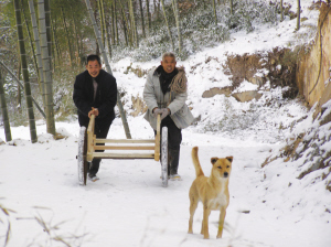 2009年12月29日,一场大雪过后,嵊州雅璜乡村民推着两轮车上山。