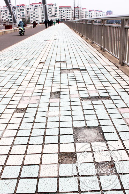 近日笔者路过嵊州大桥时发现,大桥中段南面西侧的地面有大量彩色地砖破损缺失,致使路面坑坑洼洼,给路人带来不便,也很不雅观。嵊州大桥是市中心标志性建筑,过往市民和游客众多,希望有关部门能实地踏看并尽快将缺失的地砖修补上。