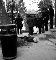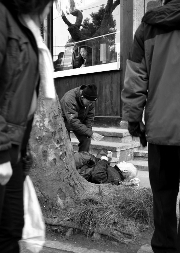 浙江在线01月11日讯 据《青年时报》报道 1月8日下午4时许,一位85岁的老爷子在鼓楼南宋御街上不慎跌倒。老人在地上躺了近20分钟,临街商铺和街上众多围观者,无一人主动上前将老人扶起。据说,有人觉得“老人摔倒以后,不要随便动他为好”,但是也有人承认,“怕扶他起来还要负责任,赔钱”。杭州某论坛网友“蟋蟀5”和朋友“甜甜稀饭”正好路过此地,用镜头记录下这一幕众生相。