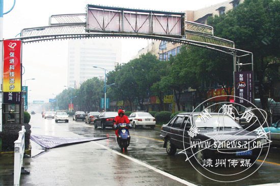 昨日下午2时左右,市区官河路农村合作银行地段一跨街龙门广告架上的一个巨幅广告牌突然“从天而降”,砸中机动车道上一辆正由北向南行驶的桑塔纳轿车。该轿车后厢被砸得变形并穿孔,所幸无人员伤亡。