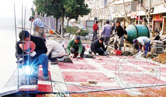 经过一个多月的紧张施工,位于江滨西路的长乐江堤坝修复加固工程已接近尾声,受“莫拉克”台风影响发生坍塌的200米堤坝已全部修复,附近400米堤坝也进行了加固。目前,施工人员正在铺设人行道上的行道砖,护栏装置也正在安装中,中断了5个月之久的人行道将重新贯通。图为施工现场。