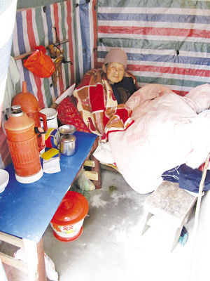 江心洲街道永定村一间紧挨着江心洲中学的农家小院内,住着一位已经九十岁的老太太,严格地说,应该是院子角落的一个窝棚里住着位老太。记者见到老太的时候,她正披着毛毯坐在被窝里,看得出她很冷。记者打量了一下老太家。一块塑料布挡着窝棚,这是“门”。窝棚的四周也用塑料布包裹着,应该是为了防风,但塑料布的防寒效果显然差强人意,不然老人也不会瑟瑟发抖。老人睡的是一张木板床,旁边还有一张小木桌,上面摆放着茶壶茶缸等生活用品,这就是她所有的家当了。老人的床头挂着条毛巾,另外还有几根似曾相识的东西,记者靠近一看,居然是几根已经冻得发硬的油条。老人说,这是昨天的早饭,小孙女送过来的,饿了就放到碗里用开水泡着吃。