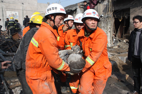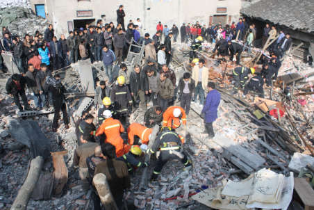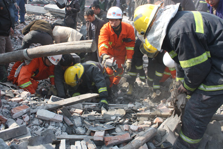 爆炸现场消防人员用生命探测仪在搜救