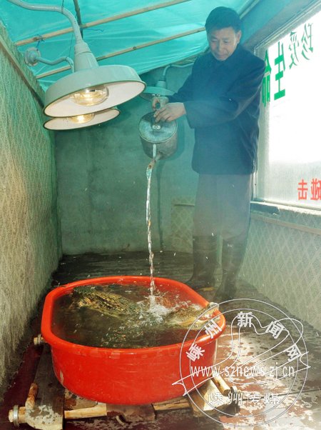 热带动物鳄鱼在我市如何过寒冬?市虎居动物园对新引进的18条热带鳄鱼,采用温室保温,确保其存活。图为饲养员在喂饲鳄鱼前,采用38摄氏度左右的温水进行冲击,刺激鳄鱼的食欲。
