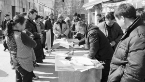 昨日,由嵊州市一群网友发起的乡村关爱活动在该市竹溪乡举行,这些网友中有特长的人员还为当地群众开展免费理发、修理家电和送春联等活动,受到山村群众的欢迎。图为书法爱好者正为群众现场书写春联。 (来源:绍兴网—绍兴晚报)