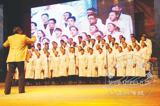 晚会上,医院职工载歌载舞,回顾了市人民医院的发展历程,展现了医院职工的精神风貌,不时赢得全场阵阵掌声。图为晚会现场。