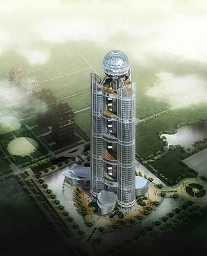 目前,摩天大楼初见规模——60层高的主楼已经封顶,三足鼎立,托起一个巨大的球体,5个空中花园,联通三足。