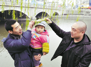 嵊州市剡湖边的几棵柳树在数场大雪后仍绿叶飘飘。据专家介绍,柳树是落叶乔木,冬季应该落叶,可能是剡湖边的小盆地气候让它在严寒的冬日里仍挂着绿枝,成为难得一见的美景。图为一位市民为自己的孩子扎柳枝帽,祝愿孩子健康成长。 (来源:绍兴网—天天商报)