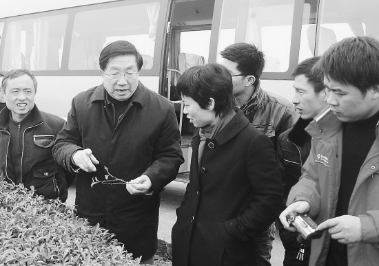 1月16日,中国农业科学院茶叶研究所、中国工程院院士陈宗懋(左二)在嵊州市崇仁镇应桂岩指导生态茶叶生产。当日,中国工程院院士陈宗懋一行,在嵊州市进行“金融危机对茶叶企业的影响及企业应对危机的对策措施”和“茶叶安全生产”方面的课题调研,并对该市华发茶厂、应桂岩名茶加工集聚区、省级现代茶叶示范区进行考察和指导。 (来源:绍兴网—绍兴日报)