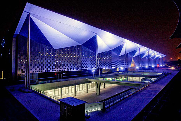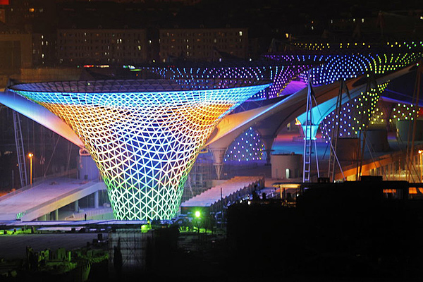 夜晚世博场馆演绎灯光秀。