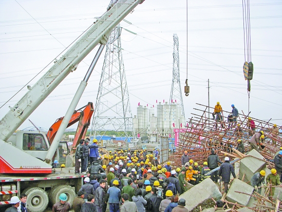现场一名姓严的工人向记者讲述了事故发生的过程。他说,被压在铁架下的3名工人,分别是来自江苏省连云港的周从礼和周严芝以及来自重庆的高太利。事发当时,他们3人正在脚手架上方协助吊车放置最后的几块水泥“试压块”。