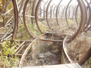 广场旁,荒草丛中湮没着辉煌的镇江“巨蛋”。记者艰难摸索进去,当初通往“巨蛋”的“蛋黄”和“蛋壳”的“时光隧道”上,坚硬的钢化玻璃多块大面积塌落,环状的护栏已经严重锈蚀。在“蛋黄”和“蛋壳”的上部,还零星可以看见不少灯泡——就是这些灯泡,曾经把“巨蛋”装扮得辉煌灿烂、绚丽夺目。进入蛋体内的几个通道大多被封死,记者从一个开着的通道看进去,看到蛋体内一副破败破落相:空空荡荡、肮脏不堪,还夹杂着霉味。