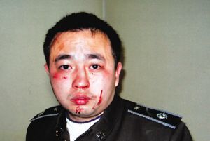 记者随后在目击整个事发经过的市容女队员小王处了解到,20日下午2点30分左右,她和另一女队员在单位值班,刘先生和其他4男2女来到市容管理办公室。情绪激动的刘先生和其他人员踢摔办公室桌椅,并摔坏市容队员茶杯。15分钟后,有5男2女市容队员陆续赶回处理此事,第一个男队员王东遭他们围攻,后来回来的市容队员林智同样遭打,但队员们都很克制,没人还手。就在这时,第二批外出执勤的市容队员赶回,市容队员宦金回办公室,意外又遭几个小摊贩拿铁凳子腿击打,并导致宦金鼻梁骨骨折,现在住在钟山医院5楼。市容队员小王解释,在小摊贩闹事过程中,我们共回来10多人,如果是市容队员打他们,他们肯定一个也出不了办公室的门。再说了大家都知道怀孕的妇女不能碰,更别说对其进行暴打了。至于刘先生的妻子倒在市容管理办公室的事情,小王认为这应该是刘先生的妻子看丈夫和人打架,过于紧张或者劝架时被误碰倒地。