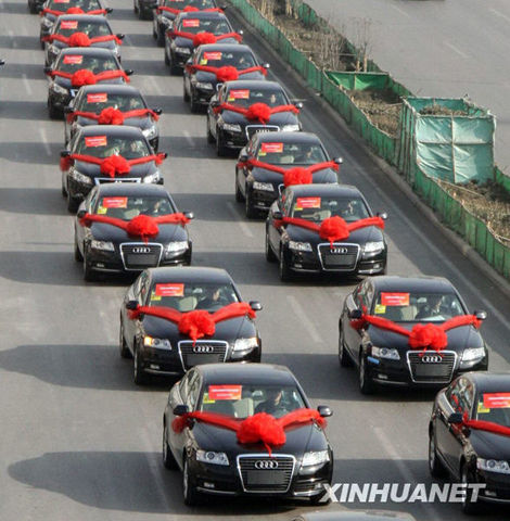 1月26日,天津北辰区奖励纳税大户的奥迪轿车在列队行驶。新华社记者刘海峰摄