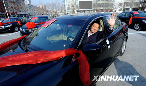 1月26日,天津一纳税大户企业的员工将奖励的轿车开走。